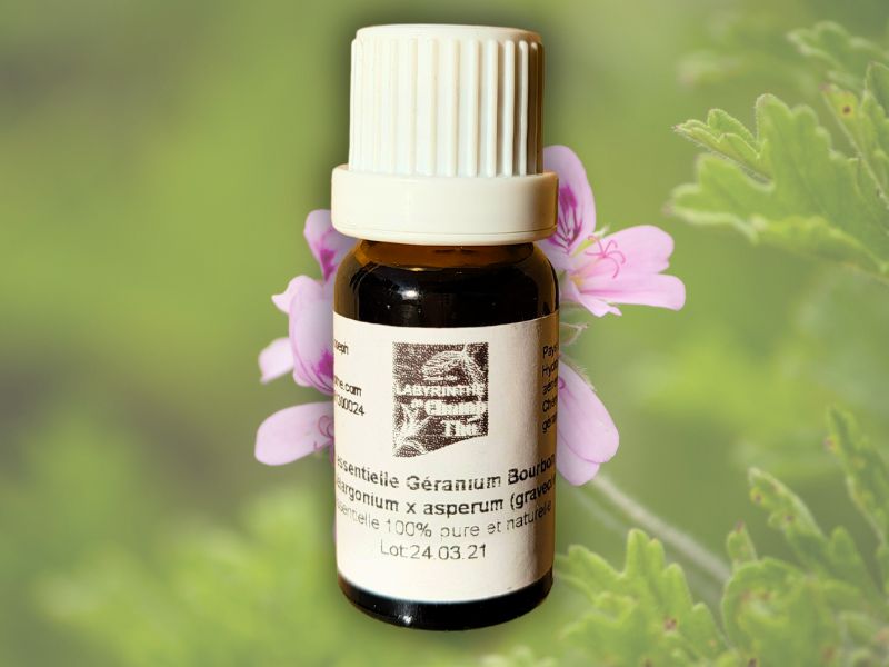 Composition : Huile essentielle de Géranium Bourbon Rosat bio Pélargonium x asperum (graveolens) distillé par le Labyrinthe en Champ Thé.